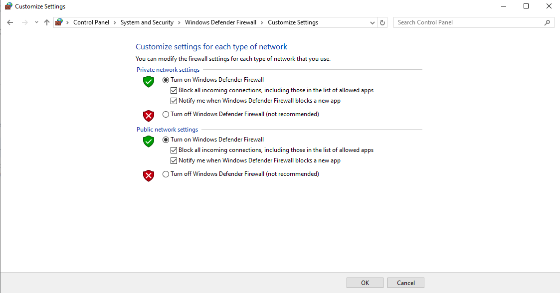 Bước 12: Chạy Windows Defender Firewall, chọ Change notification settings > và tích 2 ô Block All
